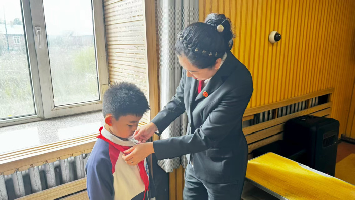 课程结束后,法治副校长融入学生中间,与孩子们亲切交谈,倾听他们的烦恼与困惑,并亲自为一年级新生系上鲜艳的红领巾。红领巾系在胸前,法治观念记在心间,孩子们庄严的表情和坚定的目光,展现出他们对法治的敬畏和对校园生活的美好期待。