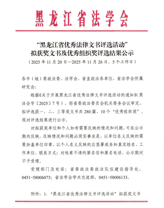在省委政法委员会、省法学会组织的“黑龙江省优秀法律文书评选”活动中,嫩江法院选送的两篇法律文书脱颖而出,荣获奖项。