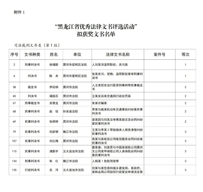 嫩江法院两篇法律文书在“黑龙江省优秀法律文书评选”活动中获奖!