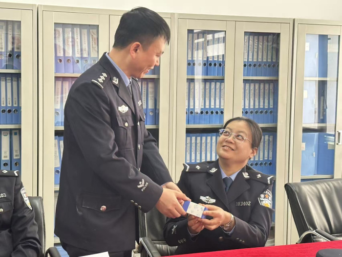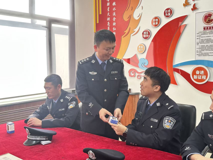 活动尾声,副队长为大家送上精心准备的小礼物。全体警员手持这份别致的小礼物合影留念,镜头里,一张张坚毅的脸庞,闪耀着司法警察的初心与担当。