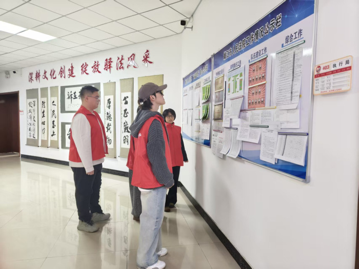 在讲解员的带领下,实习生们有序参观了诉讼服务中心、审判法庭、活动室等区域。诉讼服务中心里,便捷高效的智能化设备、贴心周到的诉讼服务,让实习生们切实感受到了司法为民的温度;审判法庭中,庄严肃穆的布置、先进完备的设施,使他们深刻体会到法律的威严与神圣;活动室内,读书角、健身设施一应俱全,体现了对干警的人文关怀。读书角里,丰富的法律书籍整齐排列,浓厚的书香气息扑面而来。实习生们穿梭其中,或驻足翻阅,或轻声交流,沉浸在知识的海洋中,为未来的法律之路汲取养分。